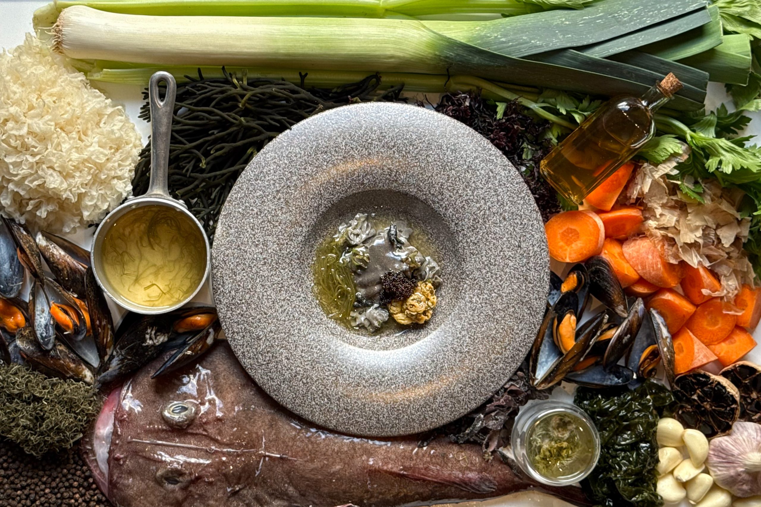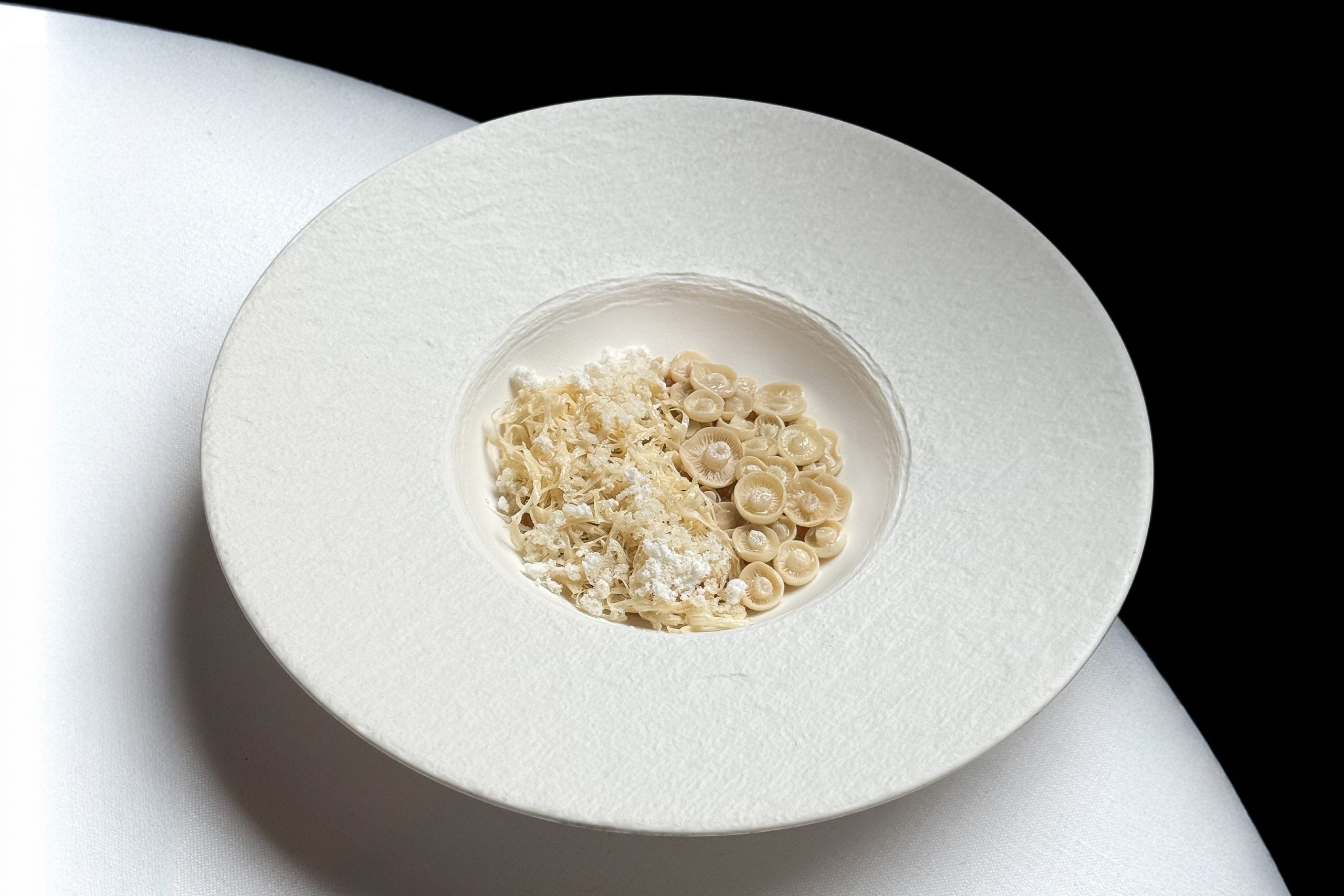 Tras los aperitivos asistimos al paseo matutino de Juliana de Orange en Keukenhof, María Cristina de Austria en la Granja de San Ildefonso y María Luisa Fernanda de Borbón por los Reales Alcázares de Sevilla. Reina, princesa e infanta. Tres gambas de Denia, aristócratas, señoriales, desprovistas de regalías en sus distintos calibres, acontecen ante la mesa para el deleite del comensal. Tras la aristocracia dienense, sorprende un «guiso de ballena» inspirado en el ámbar gris, con un rape excelente en su punto de cocción y una salmuera de kombu que le aporta jugosidad.